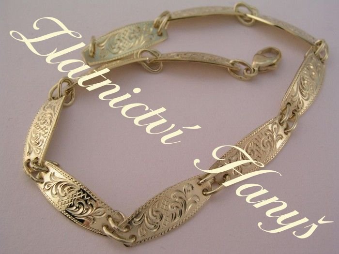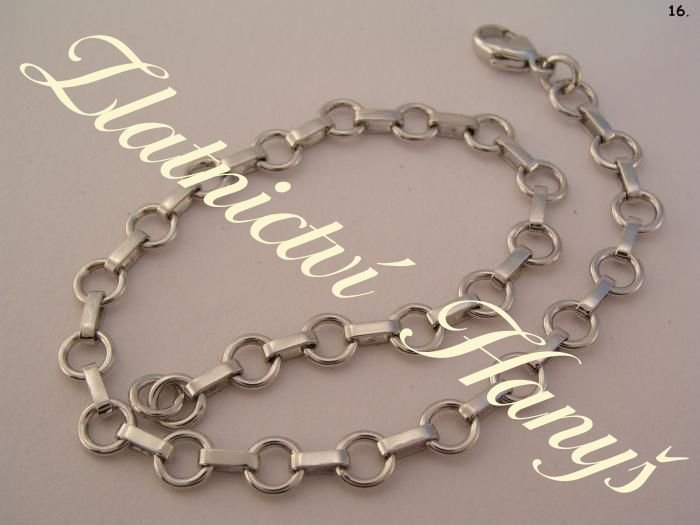 Řetízky a náramky strojové (metráž), článkové, ručně vyráběné ze zlata (žluté, bílé), stříbra, chirurgické oceli různých typů.
